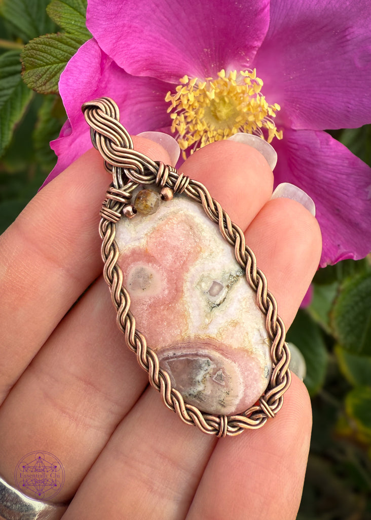 This copper wire wrapped pendant features a stunning Rhodochrosite stone swirled in shades of blush pink, rose, and gentle grey — almost like taffy candy stretched by hand. Its soothing color palette radiates comfort and compassion, making it a perfect heart-centered companion.