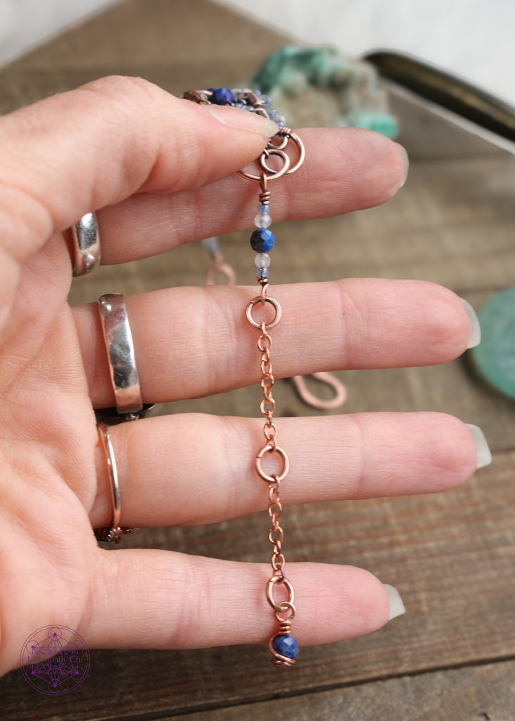 The bracelet features a 3" long by ½" wide filigree front design, showcasing high-quality faceted Lapis Lazuli and Moonstone beads woven with smoky blue glass seed beads. The open zig-zag design in the center lets light play through, highlighting the natural shimmer of the stones. Sturdy, flowing copper loops frame the sides, while the chain incorporates beaded links of faceted Lapis Lazuli, Moonstone, and smoky blue beads, tying the piece together with texture, color, and energy.